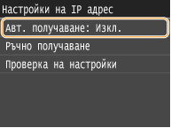 ![]() ![]() Ако не желаете да използвате DHCP сървър за присвояване на IP адрес Изберете <Изкл.>. Ако изберете <DHCP>, когато услугата е недостъпна, машината ще изгуби време и комуникационни ресурси, за да търси тази услуга в мрежата. |