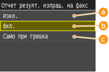 Ако изберете <Вкл.> или <Само при грешка> за <Отчет резулт. изпращ. на факс>, в отчета може да бъде включена част от факс документа. Задайте за <Вкл. изпращане на изображение> настройка <Вкл.>.