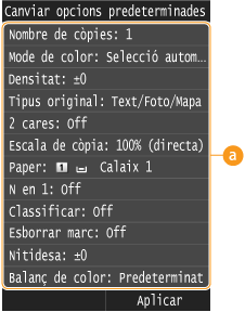 <Menú>  <Opcions de còpia>  <Canviar opcions predeterminades>  Toqueu l'opció  Canvieu el valor predeterminat de l'element seleccionat  <Aplicar>