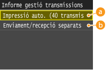 Seleccioneu <On> per imprimir l'informe cada 40 transmissions, o bé <Off> si voleu imprimir-lo manualment.