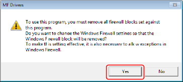 If the following dialog box is displayed during installation, select [Yes]. The Windows Firewall block is removed and you can proceed with the installation.