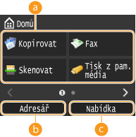 na ovládacím panelu. Tlačítka pro přístup k funkcím jsou zobrazena na obrazovce Domů. Tlačítka na obrazovce Domů můžete přidat nebo odebrat a uspořádat je tak, aby se snáze používala.