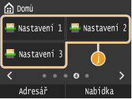 <Oblíbená nastavení kopírování> <Oblíbená nastavení faxu> <Oblíbená nastavení skenování>Zobrazí často používané nastavení uložené pro funkce kopírování, faxu a skenování. <Kopie průkazu> je předregistrováno na hodnotu <Nastavení 1>. Uložení často používaných nastavení kopírování