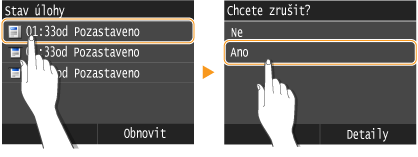 <Kopírovací/tisková úloha>   <Stav úlohy>   Klepněte na kopírovaný dokument na obrazovce <Stav kop./tisk. úlohy>   <Zrušit>  <Ano>