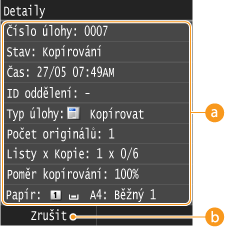Zobrazí se počet kopií, nastavení a další údaje. Chcete-li si pouze zkontrolovat údaje, aniž byste rušili kopírování, vraťte se na hlavní obrazovku kopírování stisknutím tlačítka .