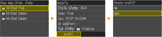 Zrušení ze Vzdáleného uživatelského rozhraníTisk lze zrušit ze stránky [Stav úlohy] ve Vzdáleném uživatelském rozhraní: Kontrola aktuálního stavu tištěných dokumentů