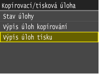 ![]() <Výpis úloh tisku>Zobrazí seznam vytištěných dokumentů. Pokud byl dokument vytištěn úspěšně, zobrazí se zpráva <OK>, pokud se dokument nepodařilo vytisknout, protože byl zrušen nebo došlo k chybě, zobrazí se zpráva <Chyba>.