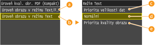 Formát <PDF (Kompakt)> komprimuje fotografie a ilustrace nacházející se v dokumentu větší měrou než <PDF>. Soubor bude menší, nicméně u některých dokumentů to může vést ke zhoršení kvality obrazu. Může také dojít k tomu, že se sníží počet dokumentů, které mohou být naskenovány najednou. Vyberete-li možnost <PDF (Kompakt)>, můžete zadat úroveň komprese.