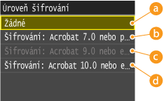Určení, zda lze zvolit <Acrobat 9.0 nebo ekvivalent/256-bit AES> a <Acrobat 10.0 nebo ekvivalent/256-bit AES>, viz Nastavení 256-bit AES pro šifrované PDF.