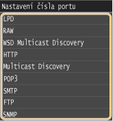 Porty slouží jako koncové body pro komunikaci s ostatními zařízeními. Pro hlavní protokoly jsou typicky použita běžná čísla portů. Vzhledem k tomu, že tato čísla portů jsou dobře známa, jsou zařízení s těmito čísly portů zranitelná vůči útokům. Váš správce sítě může změnit čísla portů za účelem zvýšení zabezpečení zařízení. Po změně čísla portu musí být pro nové číslo nastaveno sdílení s komunikujícími zařízeními, jakými jsou počítače a servery. V závislosti na síťovém prostředí zadejte nastavení čísla portu.