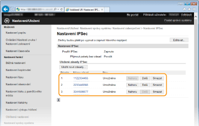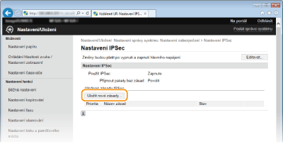 Komunikaci protokolu IPSec lze povolit či zakázat z nabídky <Nabídka>. Použít IPSec