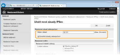 V textovém poli [Název zásad zabezpečení] zadejte jméno o délce maximálně 24 alfanumerických znaků, pomocí kterého bude možné zásadu identifikovat.