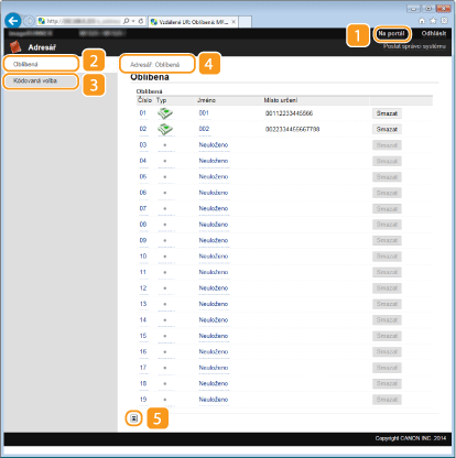 Zobrazí čísla kódovaných voleb a seznam oblíbených položek zaregistrovaný v adresáři. Pokud jste přihlášeni v režimu správce systému, lze také ukládat či měnit položky adresáře.