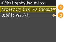 Vyberete-li možnost <Zapnuto>, vytiskne se hlášení automaticky vždy po uskutečnění 40 přenosů. Pokud nechcete tisknout hlášení automaticky, vyberte možnost <Vypnuto>.