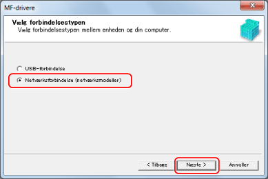 Hvis følgende skærmbillede vises, skal du vælge [Netværksforbindelse (netværksmodeller)] → klik på [Næste].