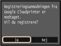 Du kan også registrere maskinen fra en mobilenhed eller Google Chrome*. Maskinens display viser følgende bekræftelsesskærm, før registreringen færdiggøres. Tryk på <Ja> for at fuldføre registreringen.