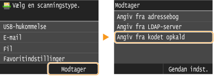 Med adressebogen kan du angive en destination ved at vælge fra en liste over registrerede destinationer eller ved at søge efter navn for destinationer med modtagernavne. Du kan også angive en destination direkte ved at indtaste et trecifret nummer (kodeopkaldsnummer), der er angivet for destinationen.