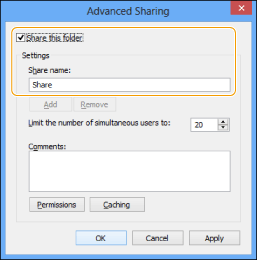![]() I Active Directory-miljøet er procedurerne for angivelse af sikkerhedsindstillingerne for den delte mappe anderledes end ovenfor. Du kan finde flere oplysninger i Windows-manualen.