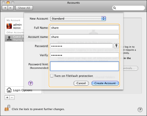 I vinduet [Accounts] (Konti) skal du indtaste navnet på den bruger, du vil sende data til fra maskinen via Mac OS X