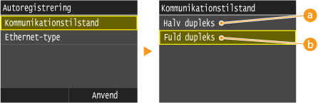 <10BASE-T>, <100BASE-TX> eller <1000BASE-T>.![]() ![]() Hvis du vil angive <1000BASE-T>, skal du vælge <Fuld dupleks> i trin 2.