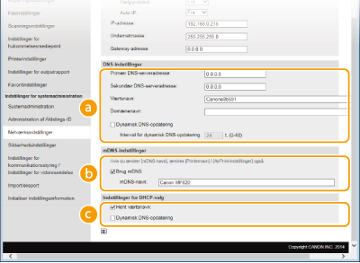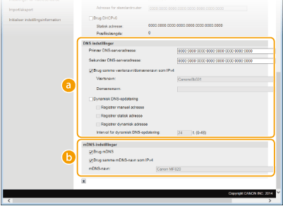 Markér afkrydsningsfeltet for dynamisk at opdatere DNS-poster, hver gang maskinens IP-adresse ændres. Hvis du vil angive den eller de typer af adresser, du vil registrere til DNS-serveren, skal du markere afkrydsningsfeltet for [Registrer manuel adresse], [Registrer statisk adresse] eller [Registrer dynamisk adresse]. Hvis du vil angive intervallet mellem opdateringer, skal du angive tiden i timer i tekstfeltet [Interval for dynamisk DNS-opdatering]. [mDNS-indstillinger][Brug mDNS]