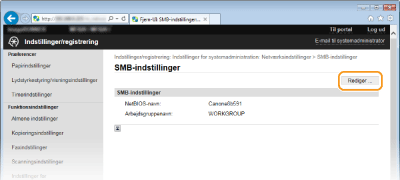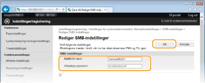 SMB (Server Message Block) er en protokol til deling af ressourcer, f.eks. filer og printere, hvor der er flere end én enhed på et netværk. Maskinen anvender SMB til at gemme scannede dokumenter i en fælles mappe. Afhængigt af dit netværk kan det være nødvendigt at angive NetBIOS-navn og arbejdsgruppenavn.