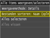 Wanneer u op <Datum/tijd (oplopend)> of <Datum/tijd (aflopend)> tikt, worden bestanden gesorteerd op basis van de datum en tijd van wijziging van de bestanden.