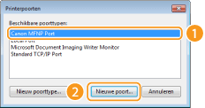 Selecteer [Canon MFNP Port] (Canon MFNP-poort) bij [Available port types] (Beschikbare poorttypen) en klik op [New Port] (Nieuwe poort).