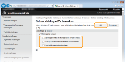 Schakel dit selectievakje in als bij het afdrukken of faxen vanaf een computer altijd een Afdeling ID moet worden ingevoerd. [Beheer afdelings-id niet gebruiken bij zwart-witafdrukken]