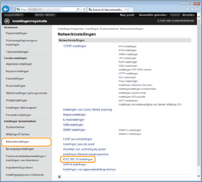 De machine kan als een clientapparaat worden aangesloten op een 802.1X-netwerk. Een doorsnee 802.1X-netwerk bestaat uit een RADIUS-server (verificatieserver), een LAN-switch (authenticator) en clientapparaten met verificatiesoftware (supplicants). Als een apparaat probeert verbinding te maken met het 802.1X-netwerk, moeten de gebruikersgegevens worden geverifieerd om er zeker van te zijn dat de verbinding tot stand wordt gebracht door een bevoegde gebruiker. Hiertoe worden verificatiegegevens verzonden naar en gecontroleerd door een zogenaamde RADIUS-server, die op basis van het verificatieresultaat communicatie met het netwerk toestaat of weigert. Als de verificatie mislukt, wordt de externe toegang tot het netwerk geblokkeerd door een LAN-switch (of een toegangspunt).