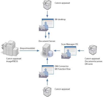 Documenten die met iW Scan Manager DS zijn geïmporteerd, kunnen worden vrijgegeven aan "Document Server", het kernprogramma van de iW series, dat in diverse zakelijke situaties wordt gebruikt.