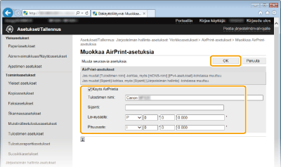 Valitse tämä valintaruutu, kun otat AirPrint-toiminnon käyttöön. Tyhjennä tämä valintaruutu, kun poistat AirPrint-toiminnon käytöstä