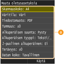 -painiketta. Jos muutat nämä oletusasetukset vastaamaan useimmin tekemiäsi toimintoja, sinun ei tarvitse määrittää samoja asetuksia uudelleen joka kerran, kun skannaat.