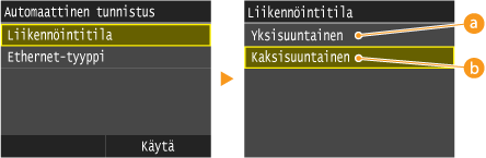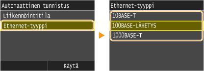 <10BASE-T>, <100BASE-LÄHETYS> tai <1000BASE-T>.![]() ![]() Jos haluat määrittää asetuksen <1000BASE-T>, vaiheessa 2 on valittava <Kaksisuuntainen>.