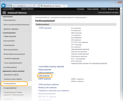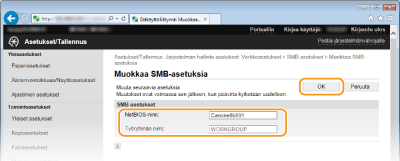 SMB (Server Message Block) on protokolla, jolla jaetaan resursseja, kuten tiedostoja ja tulostimia, useamman kuin yhden verkossa olevan laitteen kanssa. Laite käyttää SMB-protokollaa skannattujen asiakirjojen tallentamiseen jaettuun kansioon. Verkosta riippuen voit joutua asettamaan NetBIOS-nimen ja työryhmän nimen.
