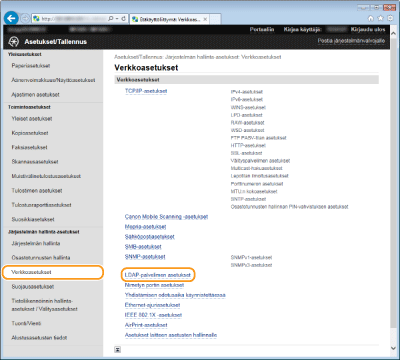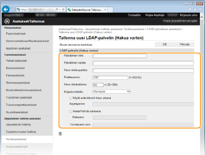 Jos verkossa on käytössä LDAP-palvelin, voit etsiä palvelimelta faksinumeroita ja sähköpostiosoitteita sekä määrittää ne sitten vastaanottajiksi tai tallentaa ne osoitekirjaan. Voit tallentaa enintään viisi LDAP-palvelinta laitteeseen. Tallenna LDAP-palvelimet Etäkäyttöliittymän avulla.