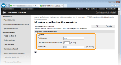 Valitse tämä valintaruutu, kun haluat asettaa laitteen vastaamaan laitehallinnan ohjelmiston multicast-hakupaketteihin ja ottaa käyttöön laitehallinnan ohjelmiston suorittaman valvonnan. [Alueen nimi]
