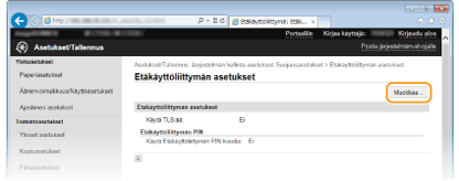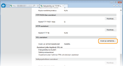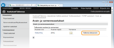 Voit salata tiedonsiirron laitteen ja tietokoneen Web-selaimen välillä käyttämällä TLS (Transport Layer Security) -salausta. TLS on mekanismi, jolla verkossa lähetettävä tai vastaanotettava data salataan. TLS-salauksen on oltava käytössä, kun Etäkäyttöliittymää käytetään IPSec:n (Esijaettu avain -menetelmä), IEEE 802.1X -todennuksen (TTLS/PEAP) tai SNMPv3:n asetusten määrittämiseen. Jos haluat käyttää TLS-salausta Etäkäyttöliittymässä, määritä avainpari ja ota TLS-toiminto käyttöön. Luo tai asenna TLS:n avainpari ennen TLS:n käyttöön ottamista (