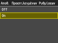 Αφού καταχωριστεί η προεπιλεγμένη ρύθμιση χαρτιού, η οθόνη ρύθμισης χαρτιού δεν εμφανίζεται όταν τοποθετείται το χαρτί, και χρησιμοποιείται πάντα η ίδια ρύθμιση. Εάν τοποθετήσετε διαφορετικό μέγεθος ή τύπο χαρτιού χωρίς να αλλάξετε τις ρυθμίσεις χαρτιού, η συσκευή ενδέχεται να μην εκτυπώνει σωστά. Για να αποφύγετε αυτό το πρόβλημα, απενεργοποιήστε την προεπιλεγμένη ρύθμιση, επιλέγοντας <Off> στο βήμα 3 και, στη συνέχεια, τοποθετήστε το χαρτί.