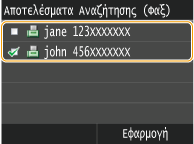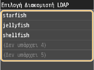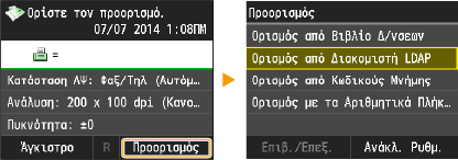 Αν στο γραφείο σας υπάρχει εγκατεστημένος διακομιστής LDAP, μπορείτε να χρησιμοποιήσετε τους προορισμούς που είναι καταχωρισμένοι στο διακομιστή. Για να καθορίσετε προορισμούς, εισέλθετε σε ένα διακομιστή LDAP μέσω της συσκευής και αναζητήστε έναν προορισμό.
