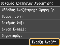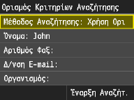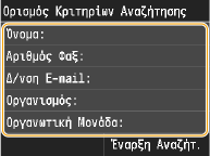 Τα διαθέσιμα κριτήρια για την αναζήτηση προορισμών είναι τα προσωπικά ονόματα, οι αριθμοί φαξ, οι διευθύνσεις e-mail, τα ονόματα οργανισμού και τα ονόματα τμημάτων. Μπορείτε να καθορίσετε ταυτόχρονα πολλά κριτήρια αναζήτησης.