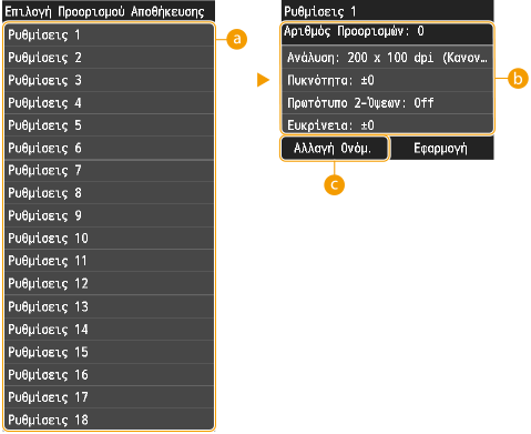 <Ρυθμίσεις 1> έως <Ρυθμίσεις 18>