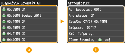 ![]() <Ημερολόγιο Εργασιών ΑΠ>/<Ημερολόγιο Εργασιών ΛΨ>Εμφανίζει μια λίστα των εγγράφων που έχουν αποσταλεί και ληφθεί. Όταν η αποστολή ή η λήψη ενός εγγράφου έχει πραγματοποιηθεί με επιτυχία, εμφανίζεται το μήνυμα <OK> και όταν η αποστολή ή η λήψη ενός εγγράφου έχει αποτύχει επειδή ακυρώθηκε ή παρουσιάστηκε σφάλμα, εμφανίζεται το μήνυμα <Σφάλμα>.