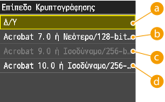 Για να χρησιμοποιήσετε αυτή τη λειτουργία, απαιτείται το προαιρετικό Send PDF Security Feature Set (Σετ Λειτουργιών Ασφαλούς Αποστολής PDF).