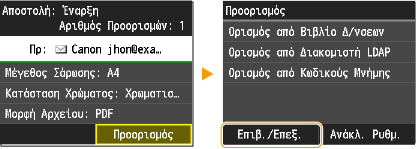 Το βιβλίο διευθύνσεων σάς δίνει τη δυνατότητα να καθορίσετε έναν προορισμό επιλέγοντας από τη λίστα καταχωρισμένων προορισμών ή αναζητώντας προορισμούς με βάση το όνομα του παραλήπτη. Μπορείτε, επίσης, να καθορίσετε απευθείας έναν προορισμό εισαγάγοντας έναν τριψήφιο αριθμό (κωδικός μνήμης) που έχει εκχωρηθεί σε έναν προορισμό.