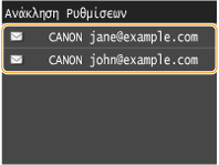 Μπορείτε να επιλέξετε έναν προορισμό από τους τρεις τελευταίους προορισμούς. Όταν καθορίζετε έναν προορισμό που είχε χρησιμοποιηθεί προηγουμένως, το μηχάνημα ορίζει τις ίδιες ρυθμίσεις σάρωσης, όπως την πυκνότητα, που είχαν χρησιμοποιηθεί την τελευταία φορά που αποστείλατε έγγραφα σε εκείνον τον προορισμό.
