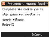 Το χρώμα του γραφίτη που πρέπει να αντικαταστήσετε εμφανίζεται στην οθόνη. Εάν πρέπει να αντικαταστήσετε πολλαπλές κασέτες γραφίτη, αντικαταστήστε τες με την ακόλουθη σειρά: Μαύρο, Κίτρινο, Ματζέντα, Κυανό.
