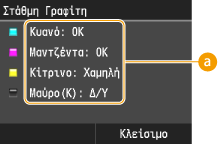 Μετά την αντικατάσταση κασετών γραφίτη, εάν τα εκτυπωμένα χρώματα διαφέρουν από τα χρώματα που εκτυπώνονταν προτού αντικαταστήσετε τις κασέτες γραφίτη, εκτελέστε <Αυτόματη Ρύθμιση Διαβαθμίσεων Τόνων> στο <Ρύθμιση/Συντήρηση>. Διόρθωση διαβαθμίσεων τόνων