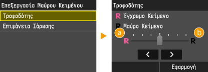 Εάν τα αποτελέσματα αντιγραφής μαύρου ή μαυριδερού κειμένου δεν είναι ικανοποιητικά, μπορείτε να βελτιώσετε την αναπαραγωγή χρωμάτων με αυτήν τη ρύθμιση. Αυτή η τιμή ρύθμισης μπορεί να οριστεί ανεξάρτητα από τον τροφοδότη και την επιφάνεια σάρωσης.