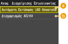 Επιλέξτε <On> για να εκτυπώνεται η αναφορά αυτόματα μετά από κάθε 40 μεταδόσεις ή <Off>, εάν δεν θέλετε να εκτυπώνεται η αναφορά αυτόματα.